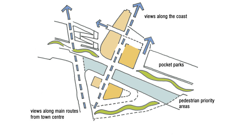 The design incorporated a family of shelters and kiosks, plus a major information and creative arts building, plus the incorporation of existing seafront buildings. Off-grid PV power generation is proposed. A selection of sustainable low-maintenance materials and generous new landscaped areas are proposed, designed to cope with the challenging position, exposed and prone to sea spray.