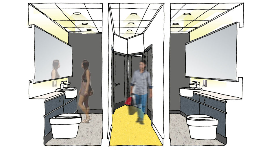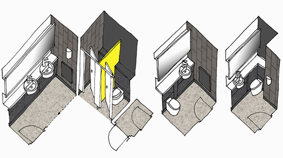 The toilets were redesigned as ‘superloos’ each containing a separate toilet and washbasin giving increased privacy. Our design for the refurbishment and reconfiguration of the kitchenettes, toilets and showers throughout all floors is developed from the palette of materials and finishes developed in the refurbishment of the Showroom Cinemas 1 and 2. Phases 1 and 2 were completed in June 2020.